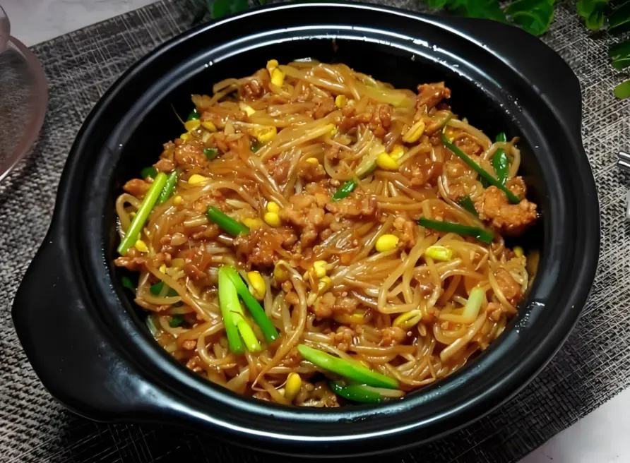 6. 加入粉条: 将炒过的粉条加入锅中,翻炒均匀,注意火力不要太大,以免粉条黏在锅底。
