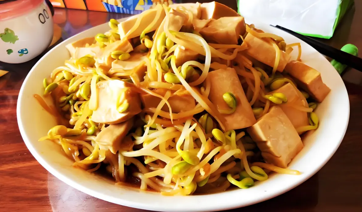 5. 加入黄豆芽: 将焯过水的黄豆芽加入锅中,快速翻炒,保持大火,使黄豆芽保持脆嫩口感。