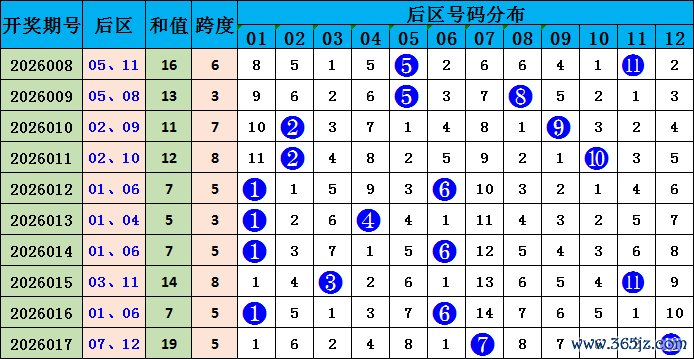 后区分析:大乐透后区上期开出奇偶组合,跨度5。近10期后区奇偶组合出现6期,偶奇组合出现1期,奇奇组合出现2期,偶偶组合出现1期;近10期后区两码跨度1-5开出6次,6-11开出4次,本期后区两码综合推荐:02、10。